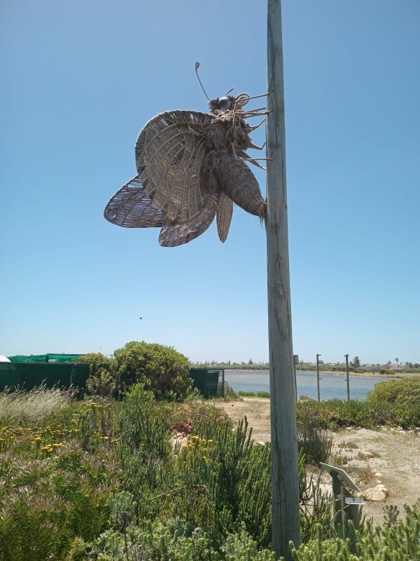 Some orange beetles are clearly enjoying the veld circle's sweet and colourful bounty Eri-kah took me to the Fynbos circle planted next to the nursery, where there is a sculpture of a butterfly, the critically endangered Barber's Cape Flats Ranger Butterfly, which had 50 remaining individuals and was predicted to become extinct within 5 years according to the Mohamed bin Zayed species conservation fund (in 2017) without drastic conservation efforts. Eri-kah explained that this beautiful butterfly is endangered because its host plant is a sedge which is seen as an ugly weed by gardeners. I didn't know about the plant connection, and that the host is a 'weed' and it made me so sad because it echoes stories about biodiversity loss from around the globe. We can learn so much from each other. Its another reason to leave the 'weeds' well alone.