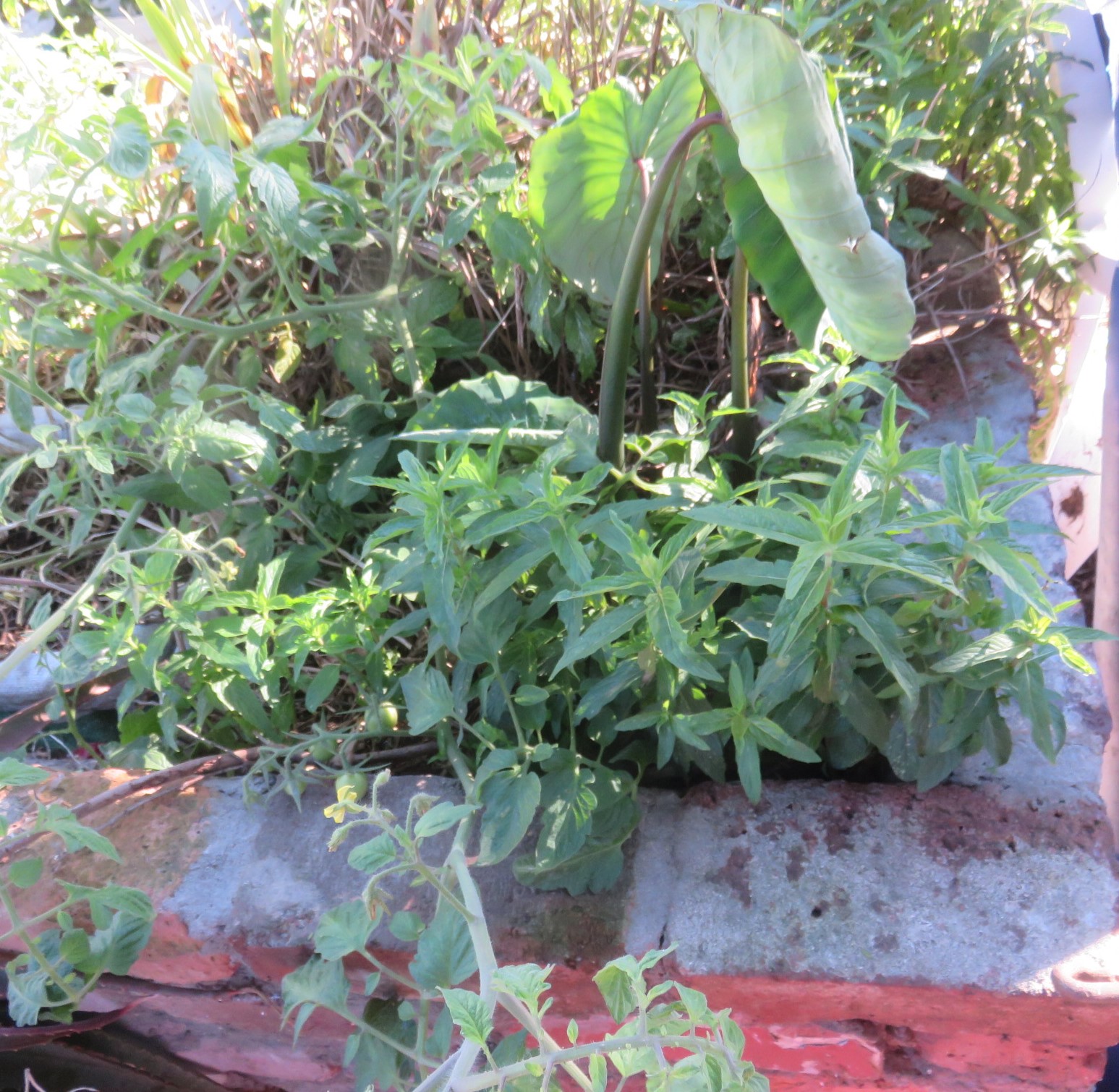 The cocoyam in summer with lots of large leaves, a little wind burned. It is growing in a bio filter which cleans kitchen grey water.The term cocoyam brings back the memory