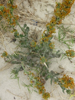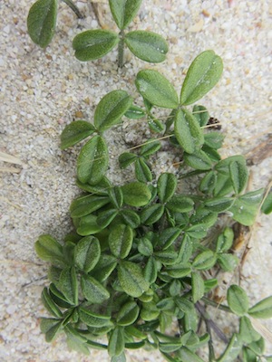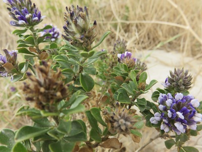 bush legumeThe one had a compact bush shape, grayish leaves and very pretty blue flowers that look a little like clover and the other had long trailing stems. The trailing stemmed variety seems to be a very important dune stabilizer as well as a nitirifier, I've seen a very similar plant with thin trailing stems 3 meters long coming off the mother clump at Haakgat on the west coast.