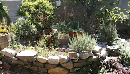 Then I imported a large number of big hewn rocks from a demolition site, and made a raised mound with them of an oval shape, unaligned with any wall, in an effort to look natural, like a mediterranean stone terrace with herbs spilling over it, and I desperately wanted to ignore the vibracrete, or make it go away. I planted shrubs in front of all the vibracrete walls. These got pulled out a few years later, and since then the huge slate rocks and the vibracrete have been in an argument about which is the ugliest, like snow white and her godmother, backwards. It doesn't show so badly in photographs, because they are two dimensional stills. But outside in the garden, your eye connects the dots that are hidden by foliage and these horizontal panels are all too obvious everywhere. Planting foliage in front of them does not 'disguise' or 'camouflage' them. I realized to make them less 'wrong' I had to embrace them. Make them into a feature of the design, not something I'm trying to hide.