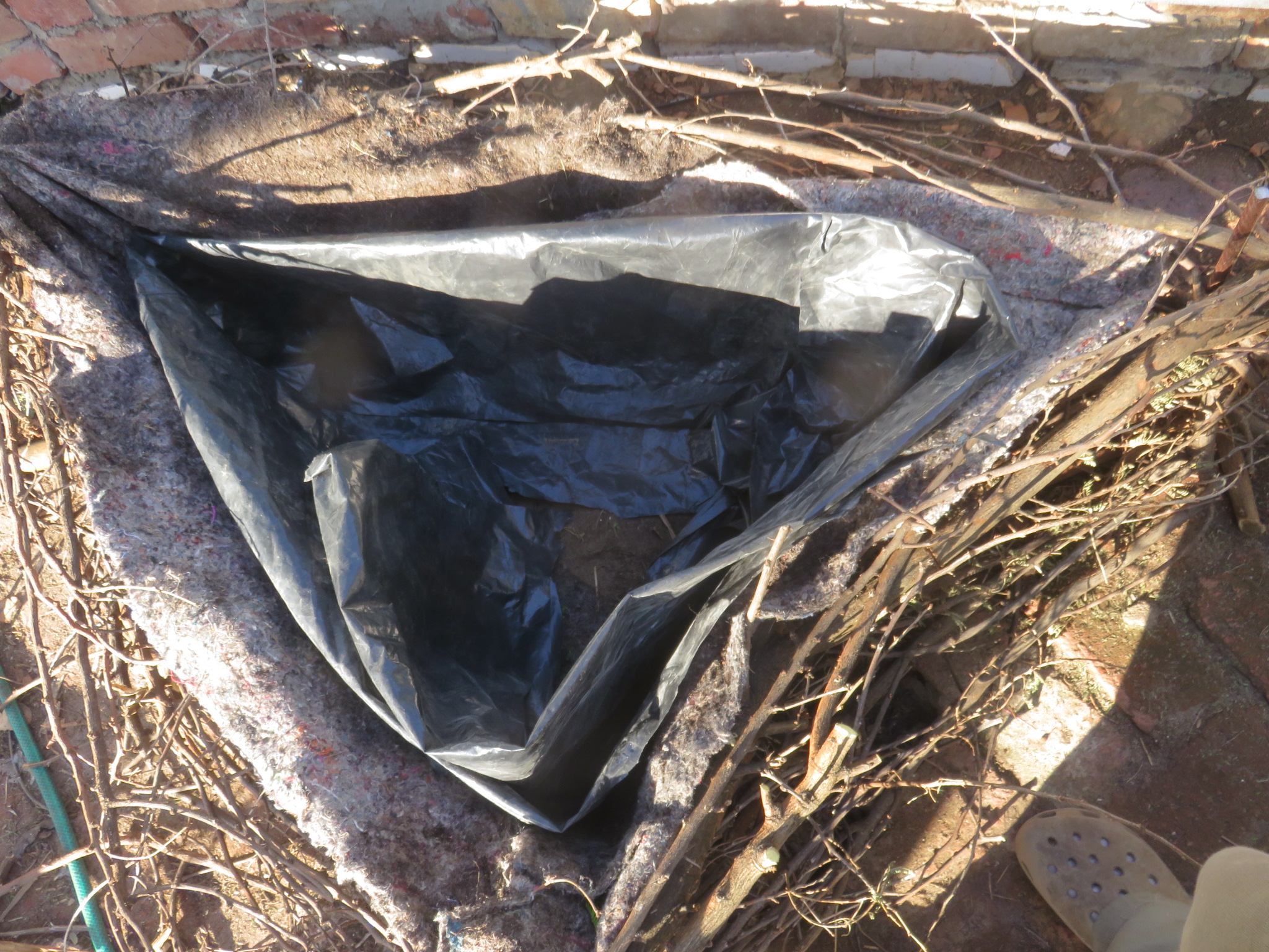 After the first three layers of sticks. You can see the rebar at the corners, but the mid winter shadows break it up a bit.Once the wall was of sufficient height, I lined the walls of the bed with carpet underfelt I had lying around, and lined the carpet underfelt with plastic, which I folded in neatly. I did this to contain the soil, and the plastic was to avoid water gushing out between the branches, instead of passing down through the bed. I left the bottom of the bed open to the soil for drainage and root-space for the plants.
